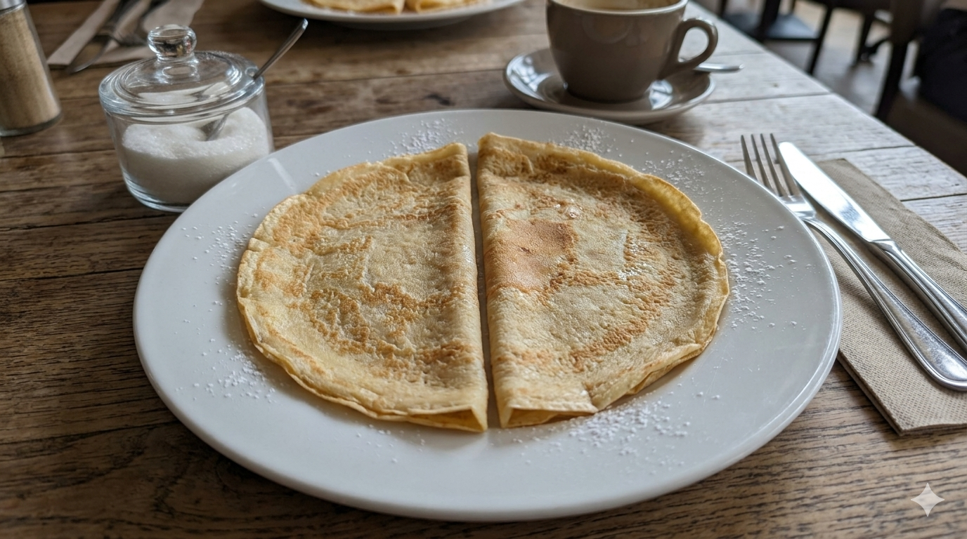 Twee warme pannenkoeken met witte of bruine suiker (ter plaatse te beslissen).
